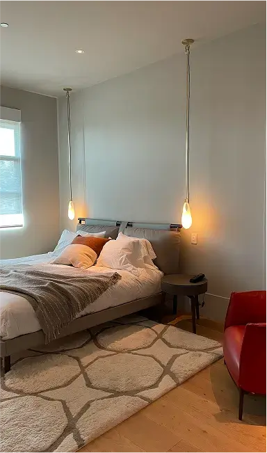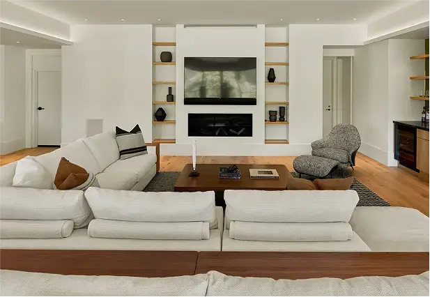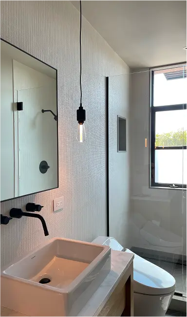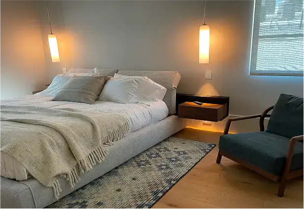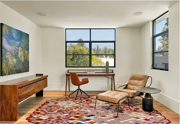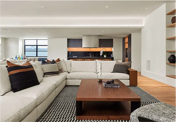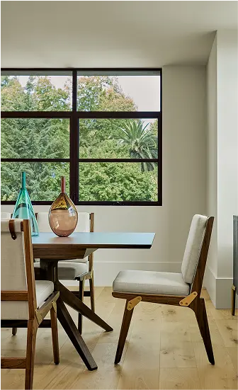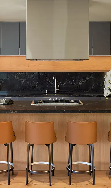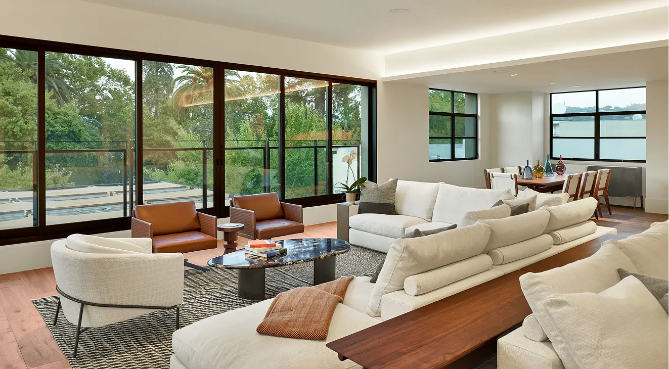 This wine country penthouse was designed as both a comfortable getaway and an inviting space for entertaining. The main living area is divided into two zones, one arranged for intimate conversation and the other oriented toward expansive glass doors that open to the view. Bright and airy finishes bring a modern take on wine country chic, with liquid-proof fabrics chosen for durability. A clean palette highlights art and designer furnishings, while authentic textures create a sense of comfort and understated elegance.