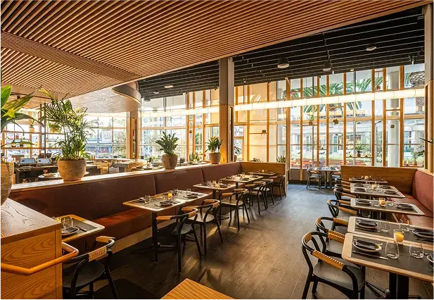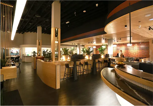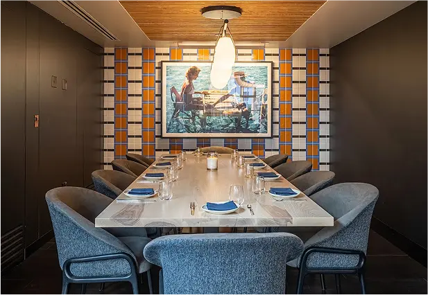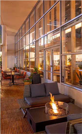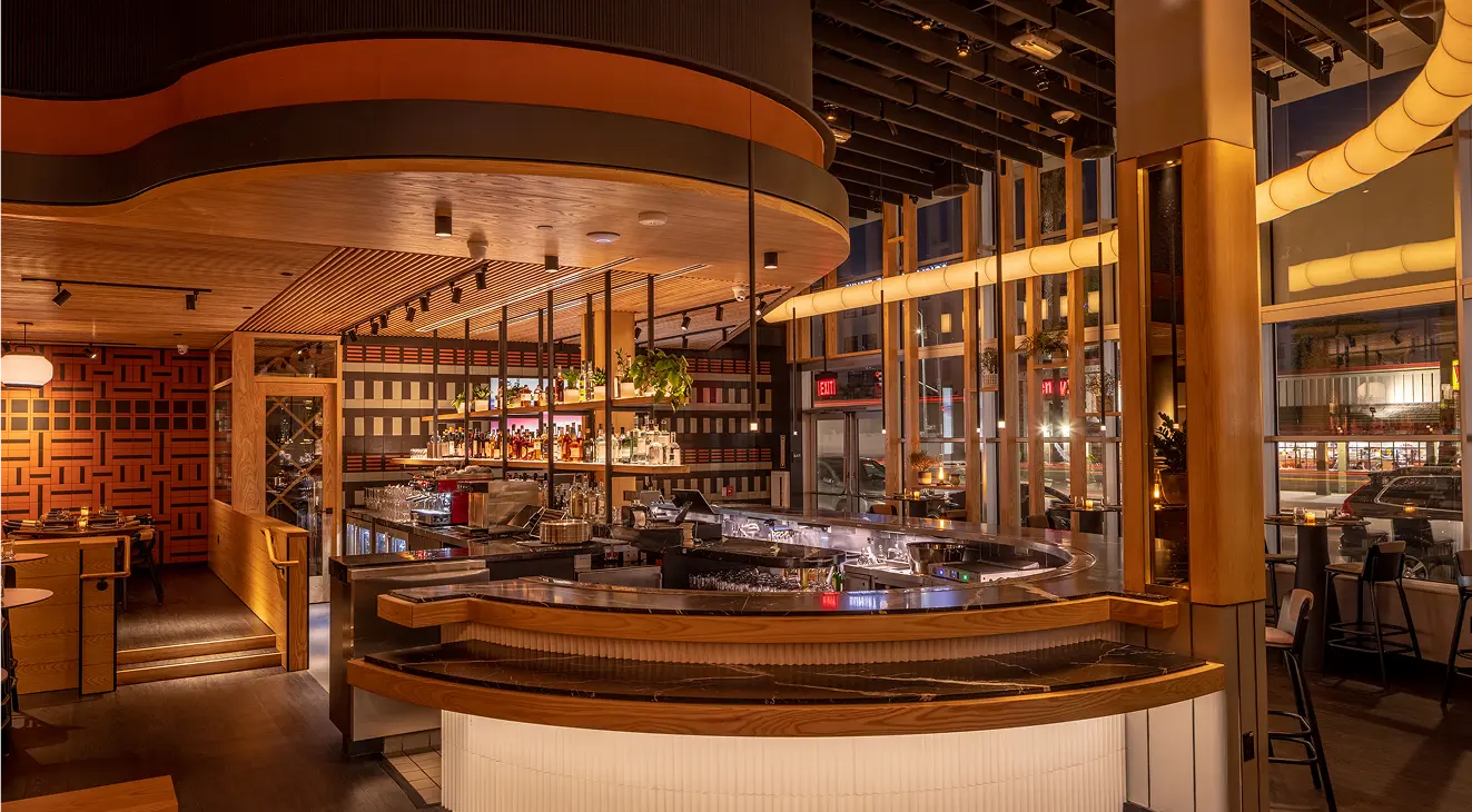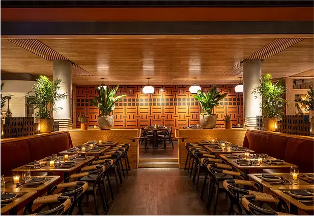 Magari brings a Tokyo-Italian dining experience to Hollywood with a design that blends Japanese precision and Italian warmth. Light-toned ash wood, slatted ceilings, and a playful grid wall create texture and warmth, while bold Memphis-inspired tile patterns give each dining area a distinct character. A glowing tubular light sculpture flows from dining room to bar, unifying the space. The outdoor garden, complete with firepits and wood decking, extends the vibrant dining experience beyond the walls.