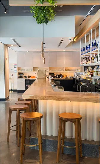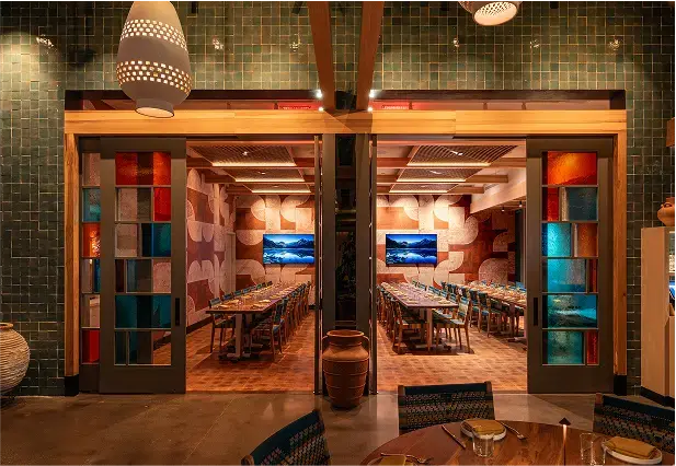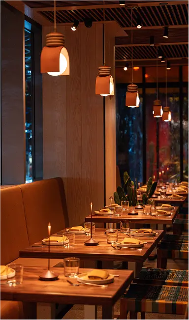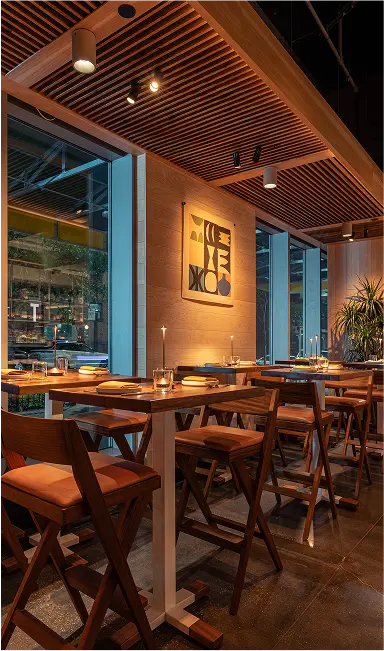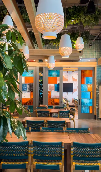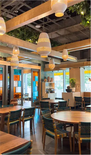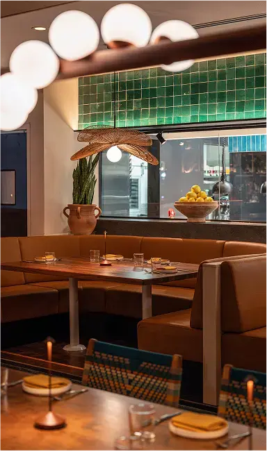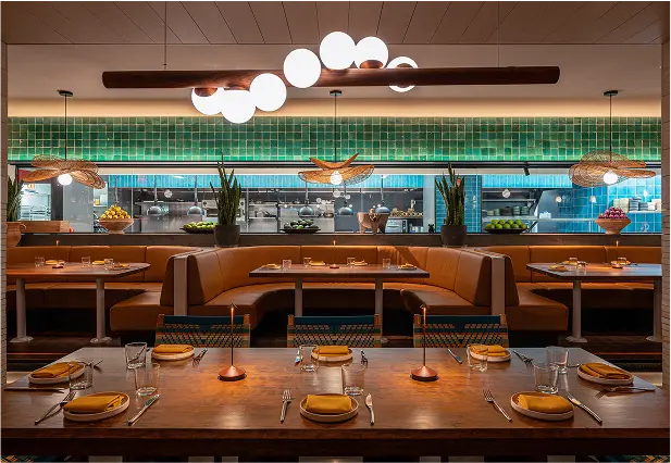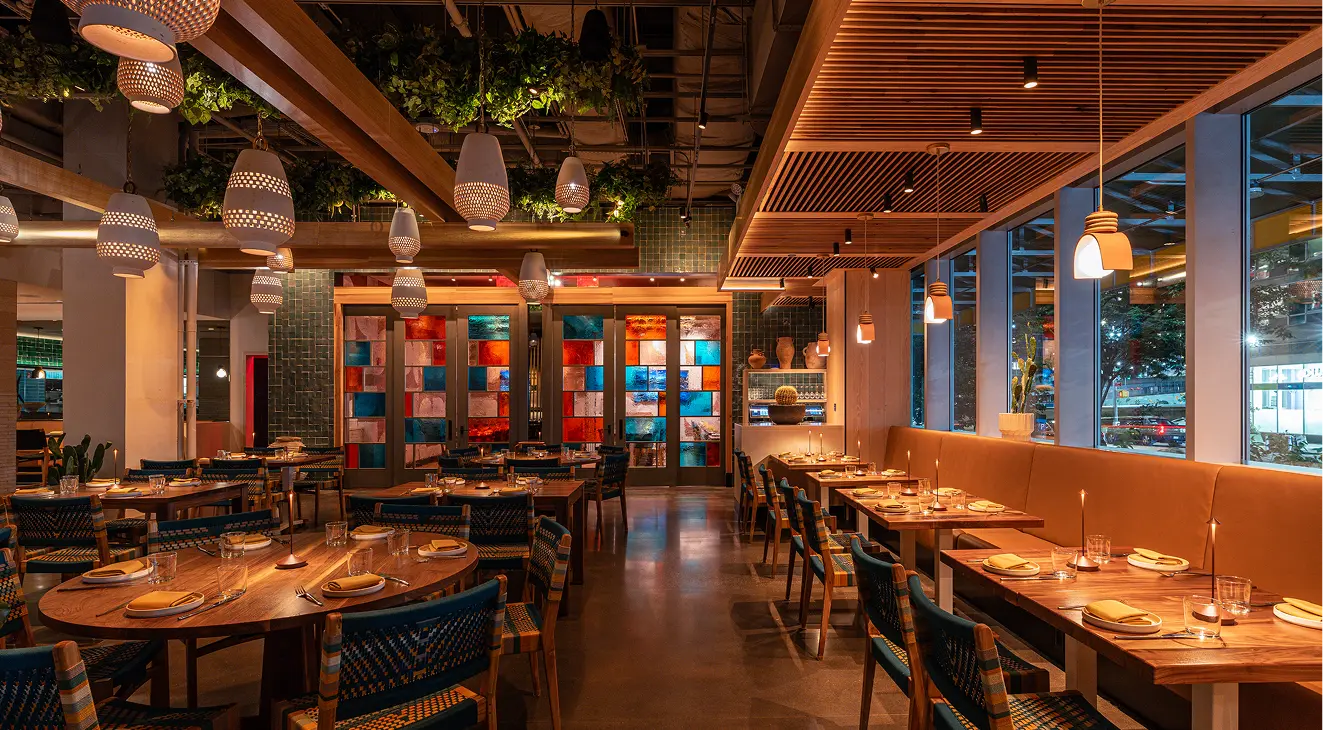 Nizuc is a 225-seat modern coastal Mexican restaurant in Hudson Yards that blends material richness with cultural authenticity. Warm woods, terracotta, and whitewashed finishes evoke serene coastal landscapes, while handcrafted Oaxacan pendants and custom furnishings highlight artisanal detail. A wraparound bar anchors the space, with an open kitchen and layered seating creating intimacy within openness. Lush greenery and sculptural cacti soften the architecture, transporting guests to Mexico’s coast.