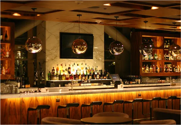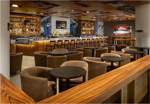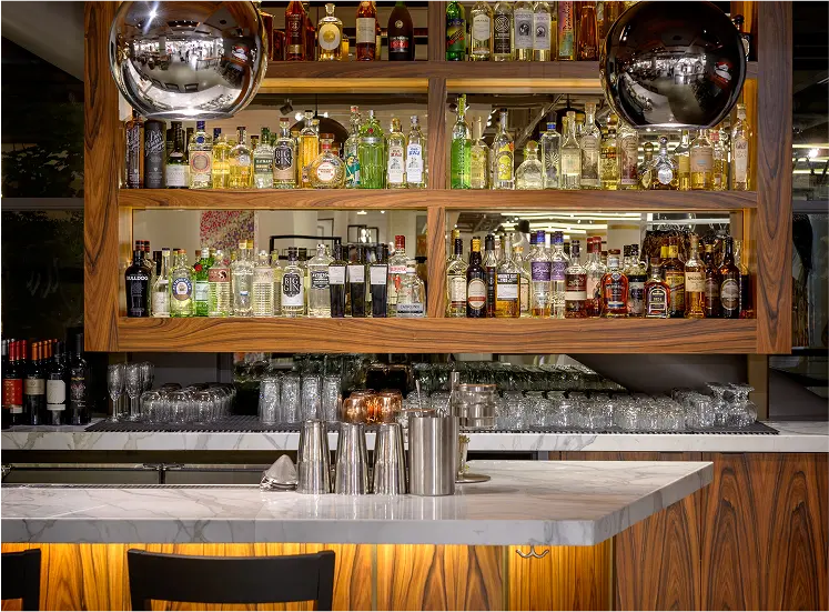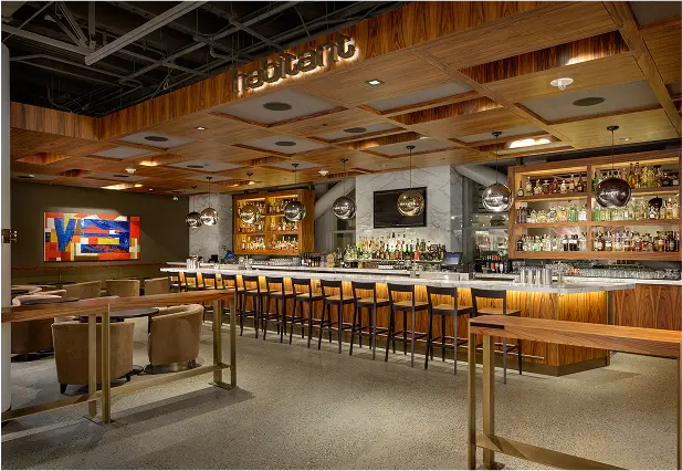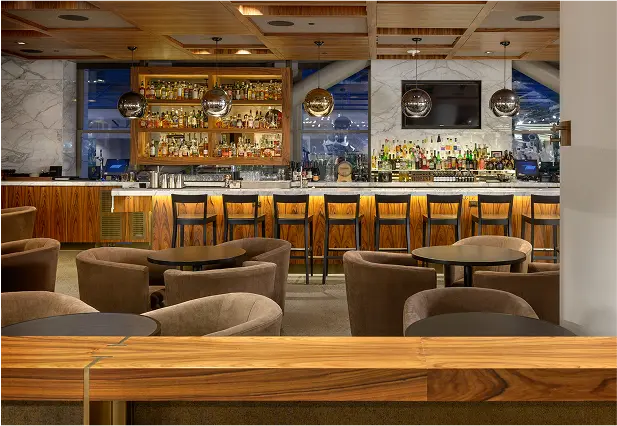Habitant is a swanky cocktail bar within Nordstrom’s flagship store in downtown Seattle, designed to evoke the timeless sophistication of Mad Men. Classic mid-century materials—rosewood veneer, satin brass, and richly textured textiles—are paired with a modern palette that feels both current and enduring. A Calacatta Oro marble bar anchors the space, framed by metallic globe pendants and a brass-and-rosewood screen wall that creates intimacy while separating the lounge from the retail world just beyond.