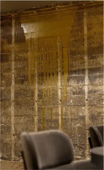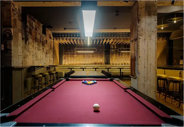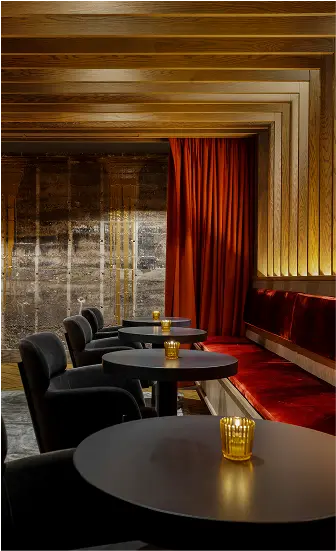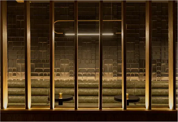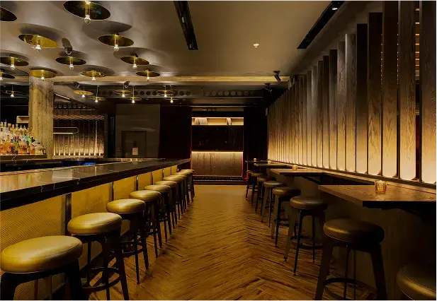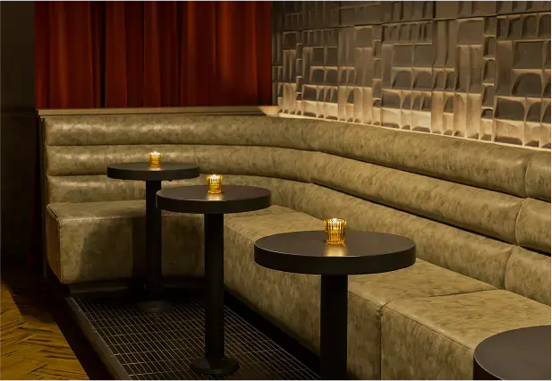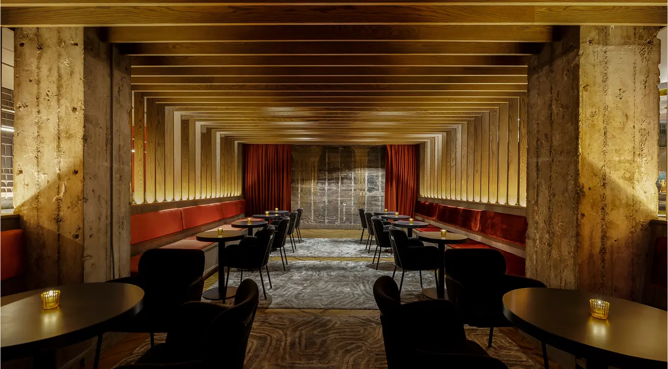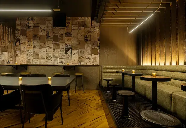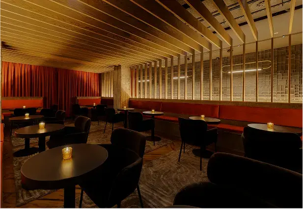 Persona is an underground bar blending the legacy of a nearby adult theater with the futuristic aesthetic of Blade Runner. The main lounge is framed by lush red velvet curtains, with a wood-slat screen concealing yet revealing the bar. One side evokes theater decadence, while the other channels sci-fi grit with raw concrete walls, futuristic banquettes, and gold resin “dripping” from above. A DJ booth anchors the space, and a secondary lounge with a pool table, popcorn machine, and custom wallcovering of vintage theater ads completes the moody, playful atmosphere.