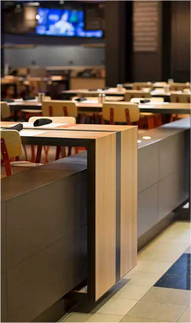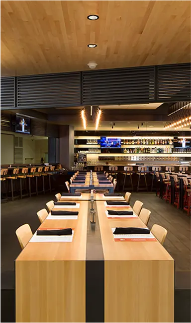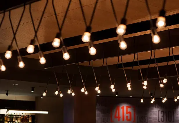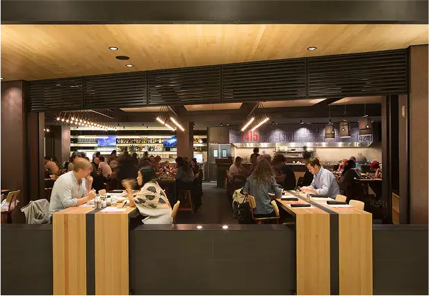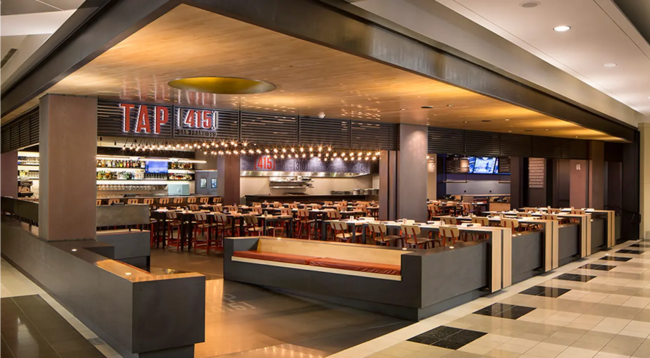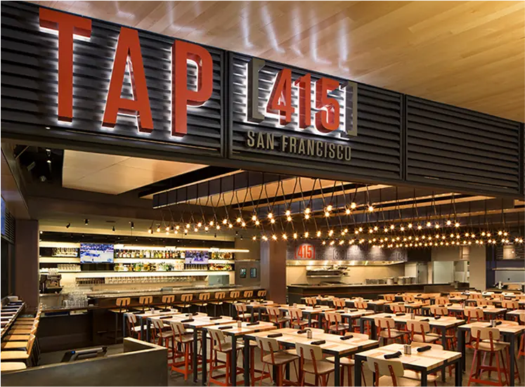 Tap 415 is a fast-casual burger and brew restaurant in a shopping center, blending a sophisticated wood-and-metal “workshop” aesthetic with an egalitarian beer garden layout. Raw materials, including patina brass, maple butcher block tables, and hot-rolled steel, reflect the craft behind the food and beverages. Open kitchen and bar views, communal tables, and intimate banquettes create a casual, convivial environment for friends, families, or date nights, while custom lighting and signage reinforce a fun, energetic atmosphere.